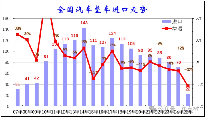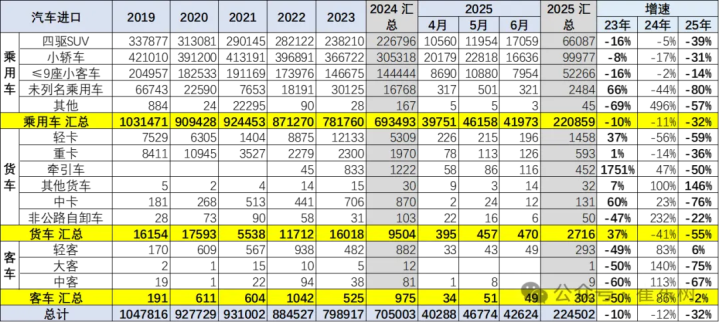 IT之家8月8日消息,乘联分会秘书长崔东树昨日(8月7日)发布博文,报告称2025上半年中国进口汽车数量为22万辆,同比下降32%,出现了近期少见的巨大跌幅,表明汽车进口市场的持续萎缩。