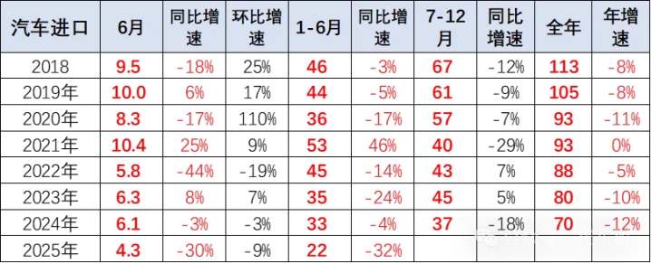 2025年6月,进口汽车下滑压力较大,日本、美国、德国、斯洛伐克、英国是进口汽车数量最多的前五个国家。然而,由于中国自主车企的崛起和国际品牌本土化加速,进口汽车市场持续低迷,进口汽车持续3年负增长,如果熨平波动,则是连续7年的负增长。