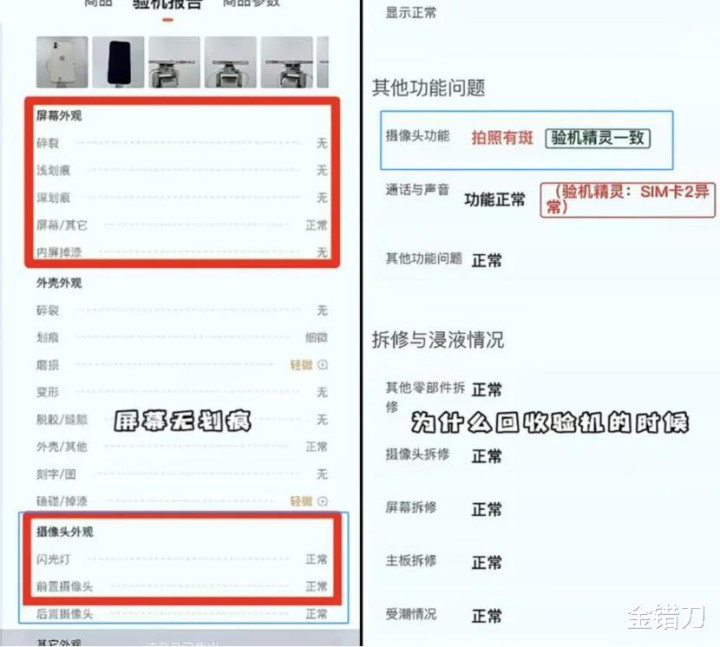 2023年11月,打假视频博主“猴大腕”发布实测视频称,转转销售手机时出具的质检报告显示手机没有问题,但同一部手机间隔不到半小时再通过转转回收时,却能查出“摄像头拍照有斑”“屏幕轻微划痕”等各种瑕疵。